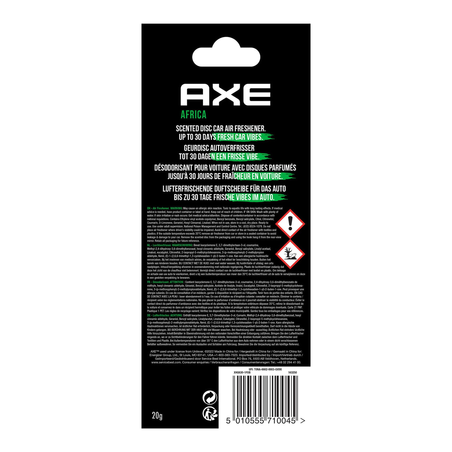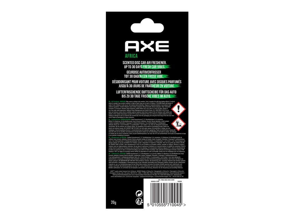 Verfris de auto met de bekende authentieke Axe geur Africa. De Axe 3D luchtverfrisser verspreidt een heerlijke exotische mix van warme Afrikaanse kruiden en aroma’s. De luchtverfrisser is met de haak eenvoudig aan de binnenspiegel van de auto te hangen en werkt tot 30 dagen.