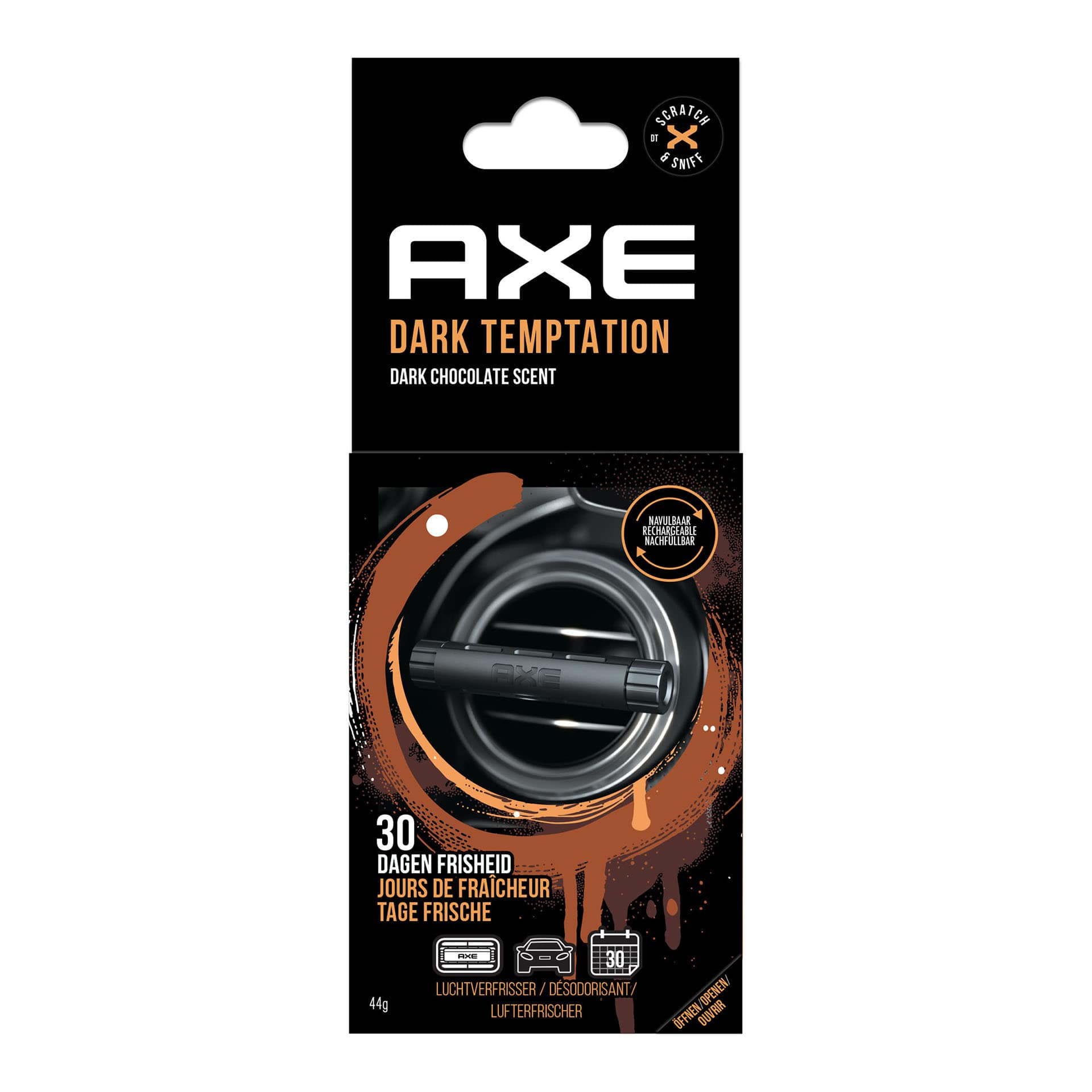 Verfris de auto met de bekende authentieke Axe geur Dark Temptation. De Axe navulbare Vent luchtverfrisser verspreidt een onweerstaanbare chocolade geur met een sensuele vanilleachtige toon. De luchtverfrisser is te bevestigen in het ventilatierooster. De intensiteit van de geur is instelbaar. Met 2 Dark Temptation patronen, werkt tot 30 dagen (2×15 dagen).