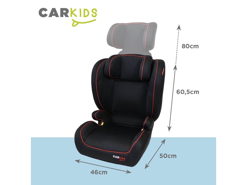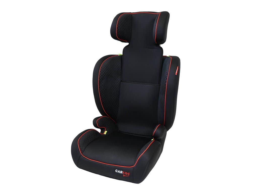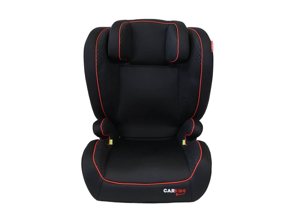 Carkids Frankie I-Size zwart autostoeltje met rode accenten, voor kinderen met een lengte van 100-150cm. Kan geïnstalleerd worden op de passagiersstoel of op de achterbank. Kan als kinderzitje of als zitverhoger gebruikt worden, met in hoogte verstelbare hoofdsteun. Voldoet aan R-129 norm, vervanger van de R44/04 goedkeuring. Door de R-129 norm zijn de zitverhogers/kinderzitjes niet meer ingedeeld in een groep maar op lengte van een kind.