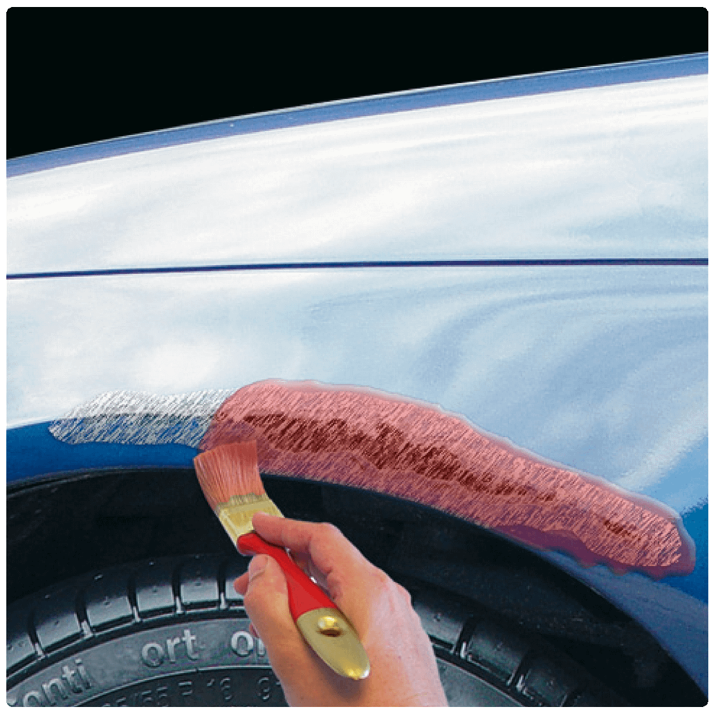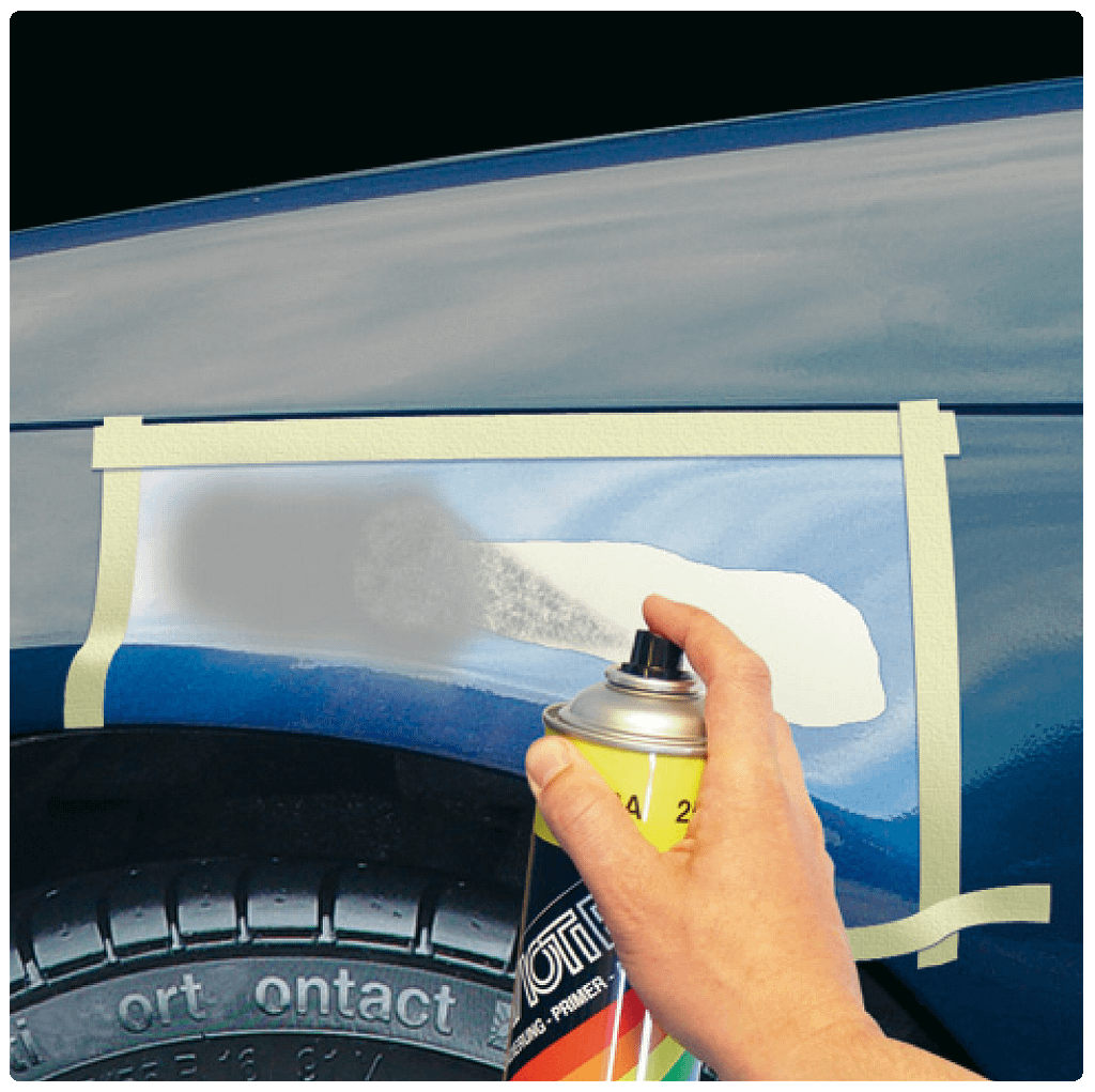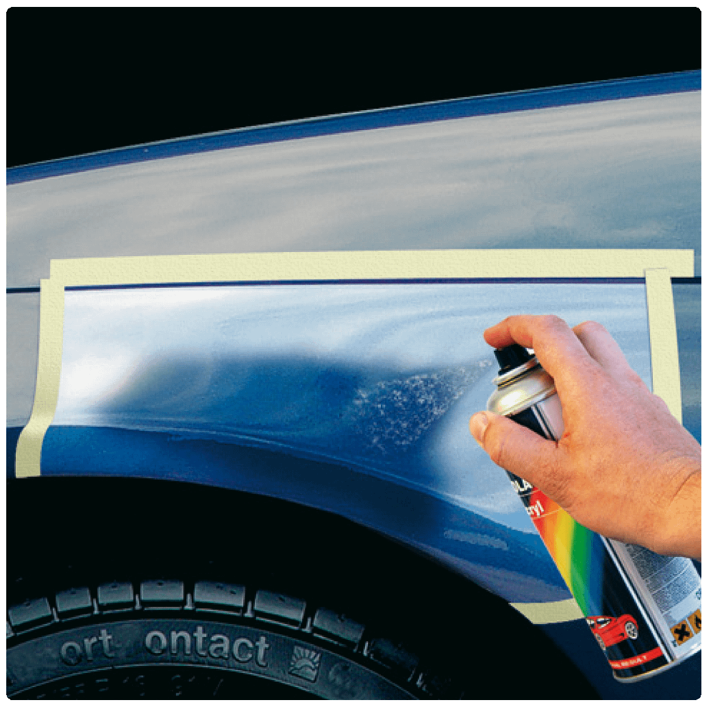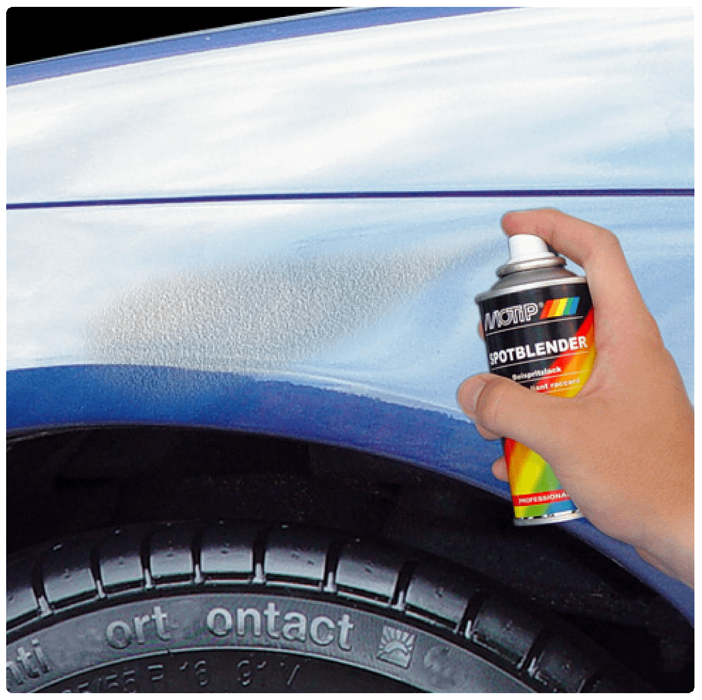 U dekt de omgeving opnieuw af (maar nu een groter gebied) en brengt de autolak in de kleur van de auto aan in meerdere dunne lagen. Voor een optimaal resultaat brengt u hierover een laag Motip Acryl Blanke Lak aan.