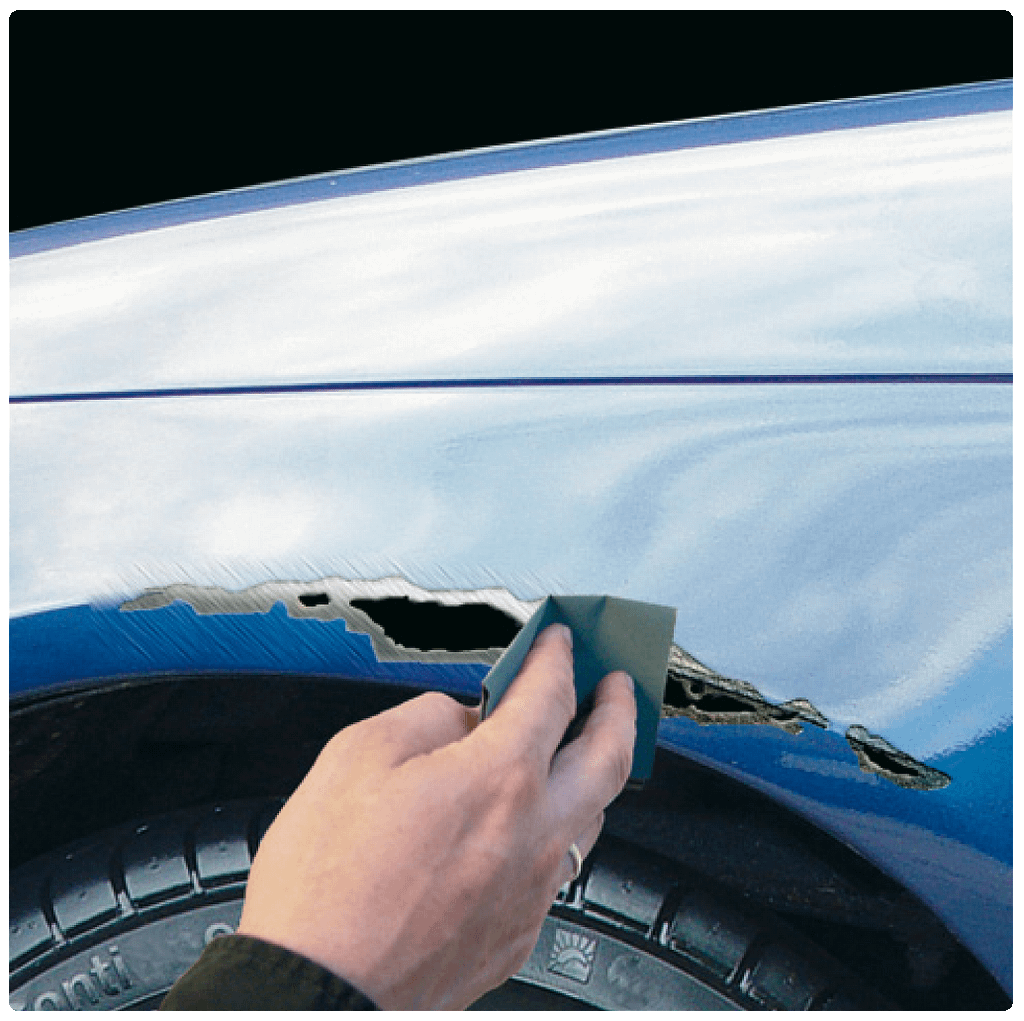 Verwijder eerst alle oude verfresten en roest. Vervolgens kunt u de plek waar het gat zit gladschuren.