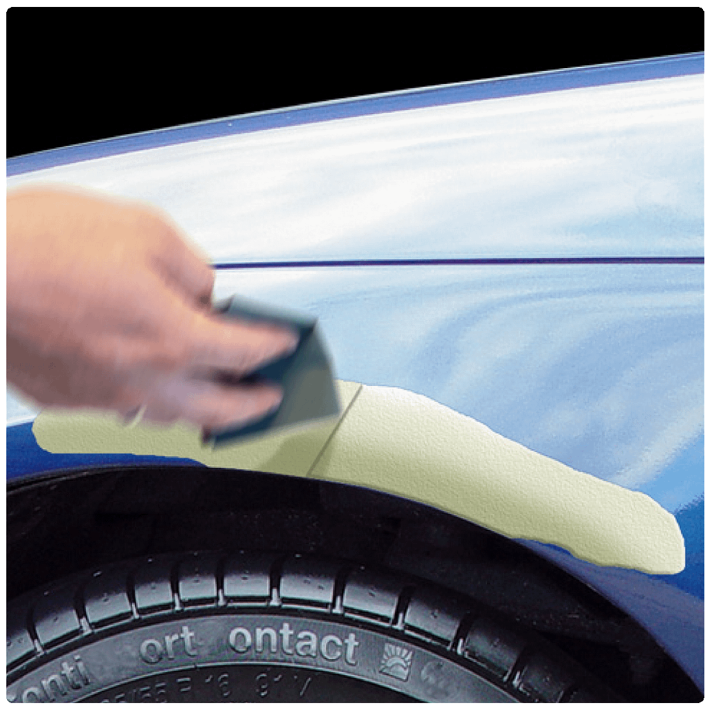 U dekt de omgeving af en brengt de primer aan in meerdere lagen. Na uitharding schuurt u de plek met korrel 1000