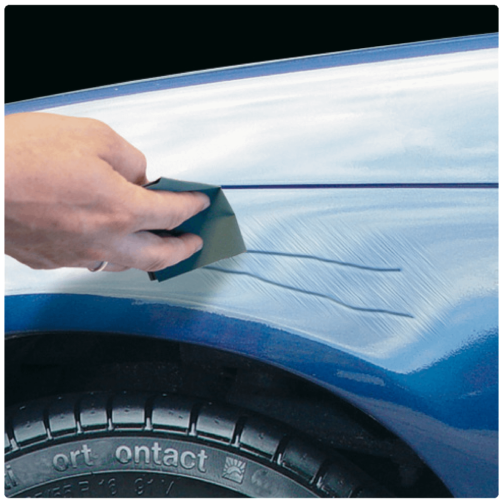 U dekt de omgeving met afplakband en bijvoorbeeld oude kranten af en brengt primer aan in meerdere dunne lagen. Na afloop schuurt u de plek nogmaals (korrel 1000)
